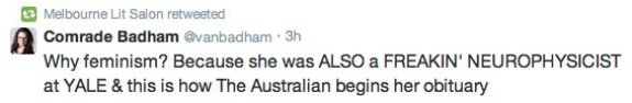 Whether this is @eBookDynasty’s intention is unknown, and it is not the point, either. As demonstrated by @MelbLitSalon’s responding tweets, the point, or the focus of debate, clearly was feminism, in the form of an attack on the sexist obituary published by The Australian, instead of McCullough’s view of herself.