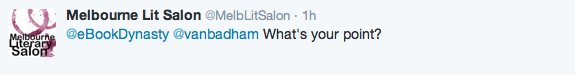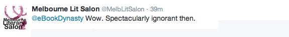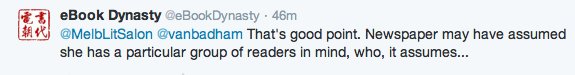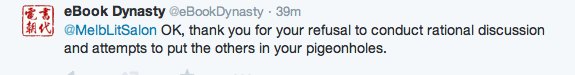 At this point, @MelbLitSalon appeared to have reached its own conclusion, despite @eBookDynasty’s efforts to clarify its previous statements: