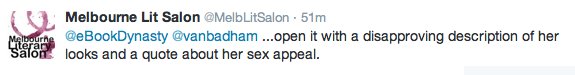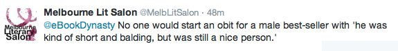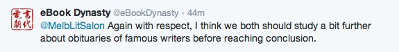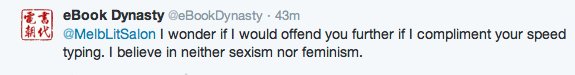 Then @MelbLitSalon again assumed @eBookDynasty as being in defense of the sexism demonstrated in the aforementioned obituary. This is despite the fact that the latter supported the former’s argument.