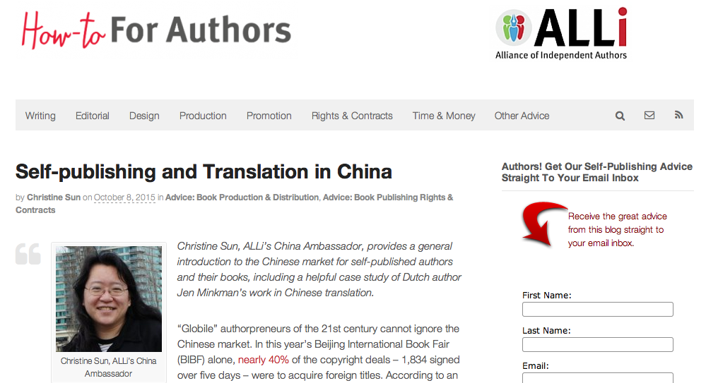 Following my previous article on the story of Fiberead, I have now written for the Alliance of Independent Authors (@IndieAuthorALLI), “a general introduction to the Chinese market for self-published authors and their books, including a helpful case study of Dutch author Jen Minkman’s work in Chinese translation”.
