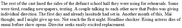 The mistake in Example One is the neglect of the word “fascinated”. In Example Two, “do it again”, “body language” and “discontent” are unnecessarily added by the Chinese translators. The most shocking mistake takes place in Example Three, where the Chinese translators have completely misunderstood the sentence “not reach the first night”. The word “ennui” is also misinterpreted as “exhaustion”, which leads to Google Translate’s “burnout”. Finally, the word “easily-excited” is misunderstood as “delving deeply into the play”, which leads to Google Translate’s “looking into the drama”.