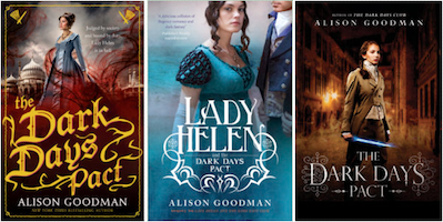 Left to right: Lady Helen and the Dark Days Pact, US & UK edition paperback; Australian edition; US & UK edition hardpack.