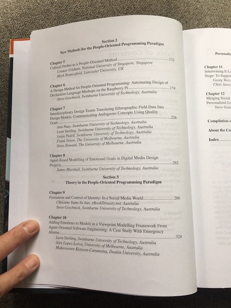 I am pleased to report that my book chapter “Formation and Control of Identity: In a Social Media World”, co-authored with Adjunct Professor Steve Goschnick of Swinburne University of Technology’s Faculty of Health, Arts and Design, is published in Innovative Methods, User-Friendly Tools, Coding, and Design Approaches in People-Oriented Programming (Steve Goschnick [ed.], Advances in Computer and Electrical Engineering Series, IGI Global, May 2018).