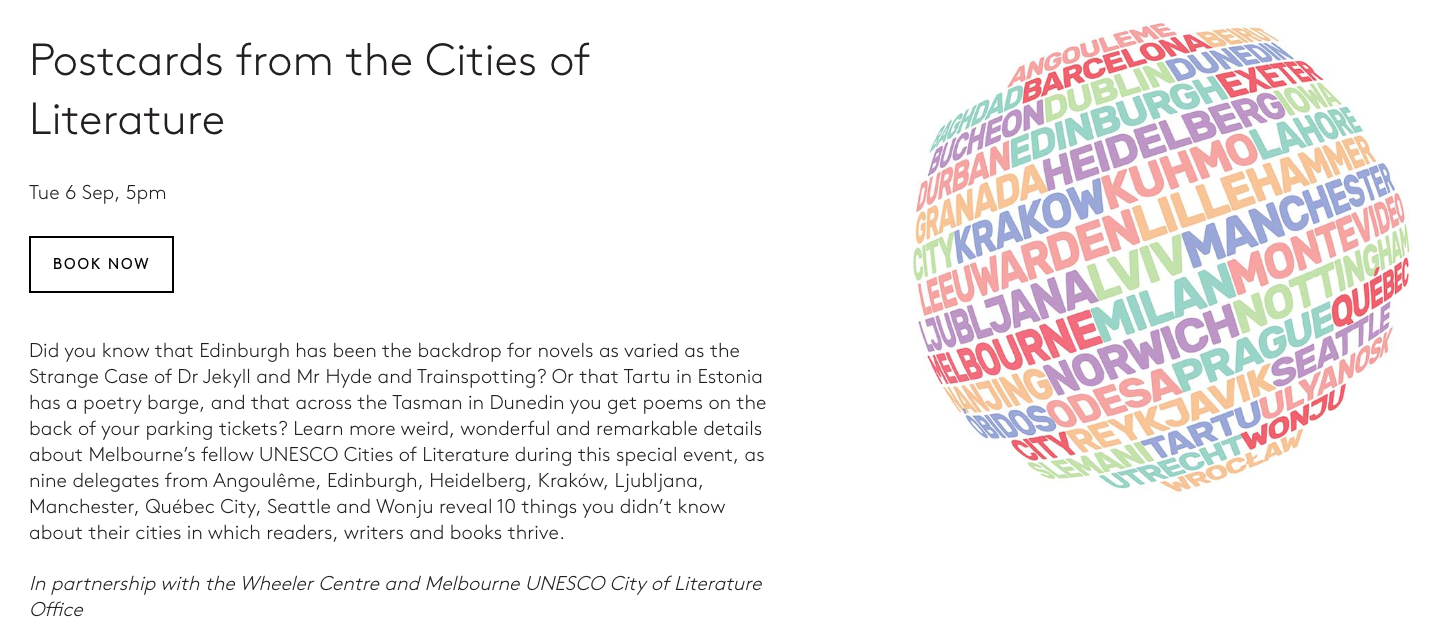 One special event to take place during the forthcoming Melbourne Writers Festival is “Postcards from the Cities of Literature”. On September 6, delegates from Angoulême, Edinburgh, Heidelberg, Kraków, Ljubljana, Manchester, Québec City, Seattle and Wonju will each share ten things about their cities in which readers, writers and books thrive.