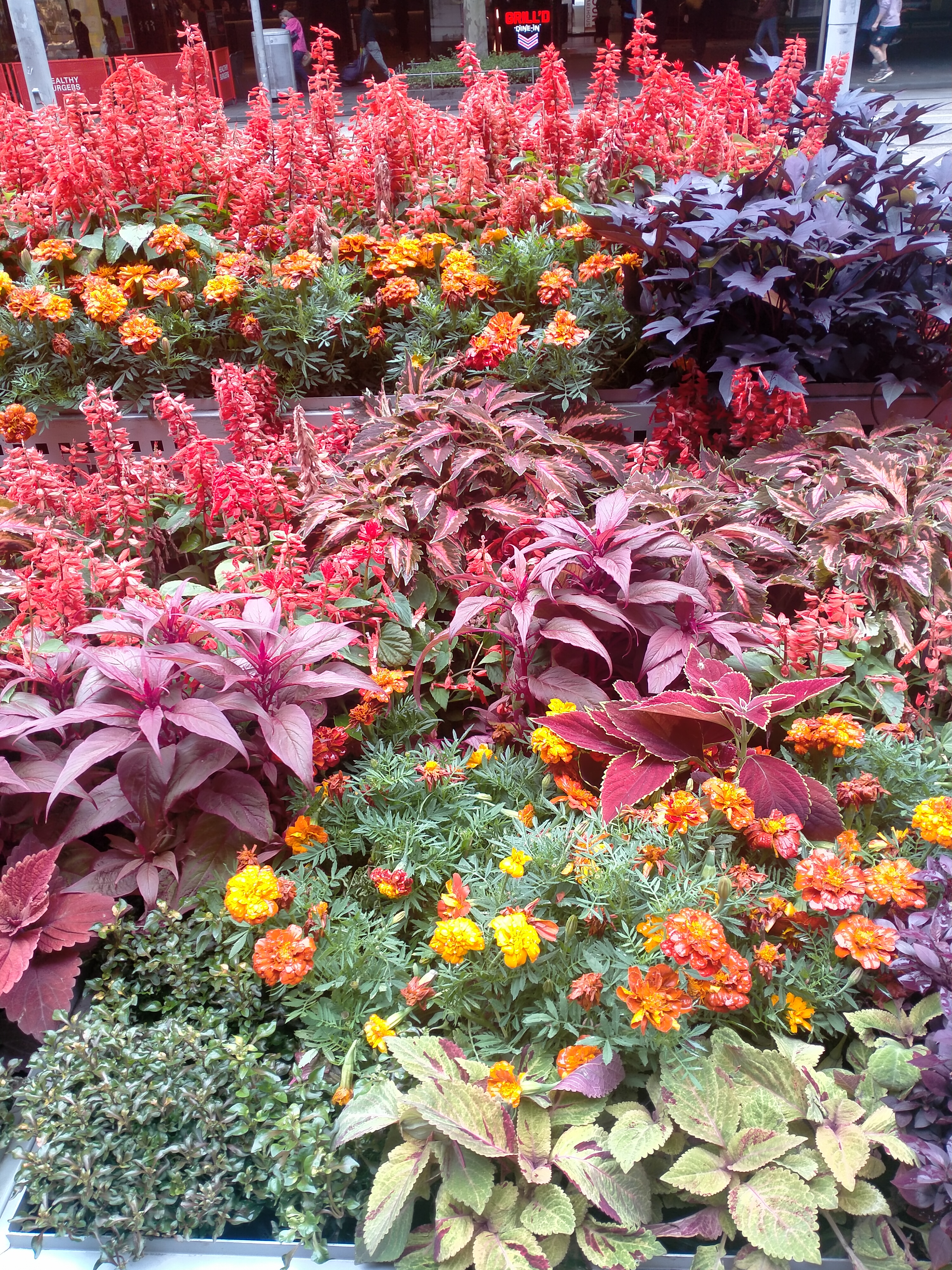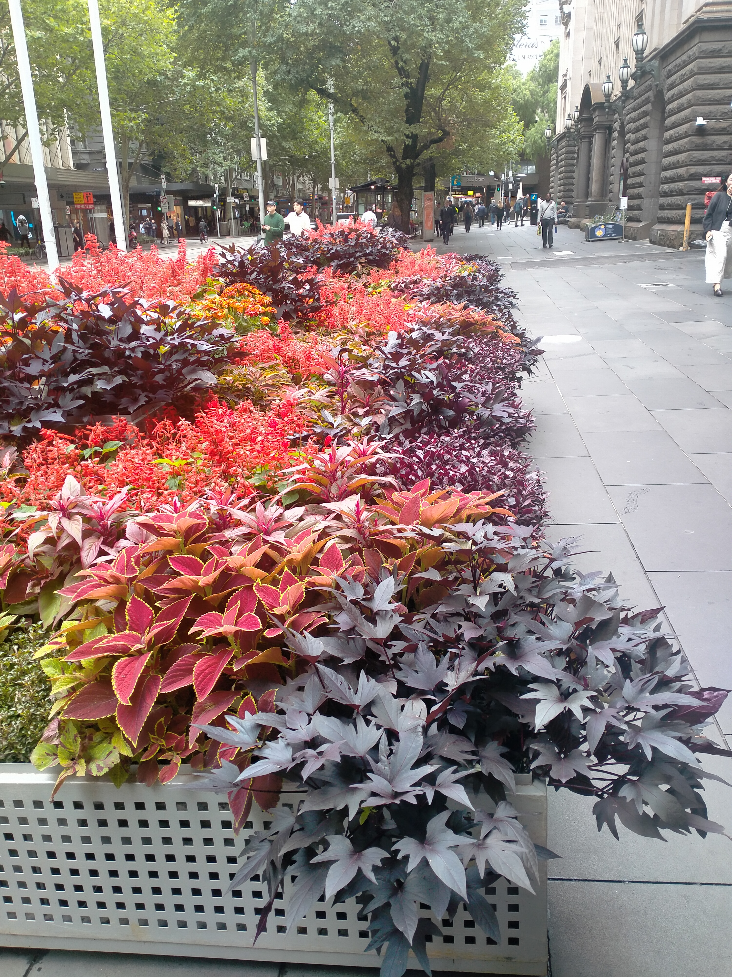 A recent trip to the city revealed some floral spectacle in front of the Melbourne Town Hall. It is a visually fascinating and delightful experience, seeing the splendid autumn colours on full display. The plants used here include various types of heuchera (commonly known as coral bells), coleus, salvia, and marigold. These are tough yet beautiful plants, suitable for dappled shade (such as the footpath in front of the town hall), although salvia and marigold would prefer a bit more sun.
