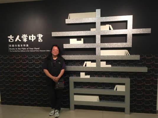 Christine at the National Palace Museum Exhibition “Books in the Palm of Your Hand”, Taipei, Taiwan, January 2019. The large character means “Book” in Traditional Chinese.