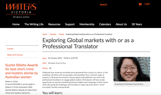 My forthcoming “Exploring Global Markets with or as a Professional Translator” workshop is made possible thanks to Writers Victoria. I also want to mention some of the workshops I have participated in recent years, from which I gained great insight into developing and delivering workshops in different styles. These include Writers Victoria’s “Running Writing Workshops” workshop for women and non-binary writers of colour (September 2018) and “The Art of Criticism: Giving and Receiving Feedback” workshop (January 2018), Film Victoria’s “Storytelling in VR” workshop (May 2018), Trade Victoria’s “Victorian Women in International Business Pan Asia Export Training Workshop” (January 2018), and Melbourne Writers Festival’s “Masterclass: Translation” event (September 2017).